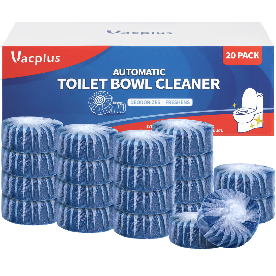 - POWERFUL CLEAN: The Vacplus automatic toilet bowl cleaner offers powerful cleaning performance, effectively removing stains from the tank, water pipe, and bowl. They not only tackle tough limescale and rust but also eliminate unpleasant odors, keeping your bathroom fresh and clean for longer. Experience superior cleanliness with our toilet cleaner.
