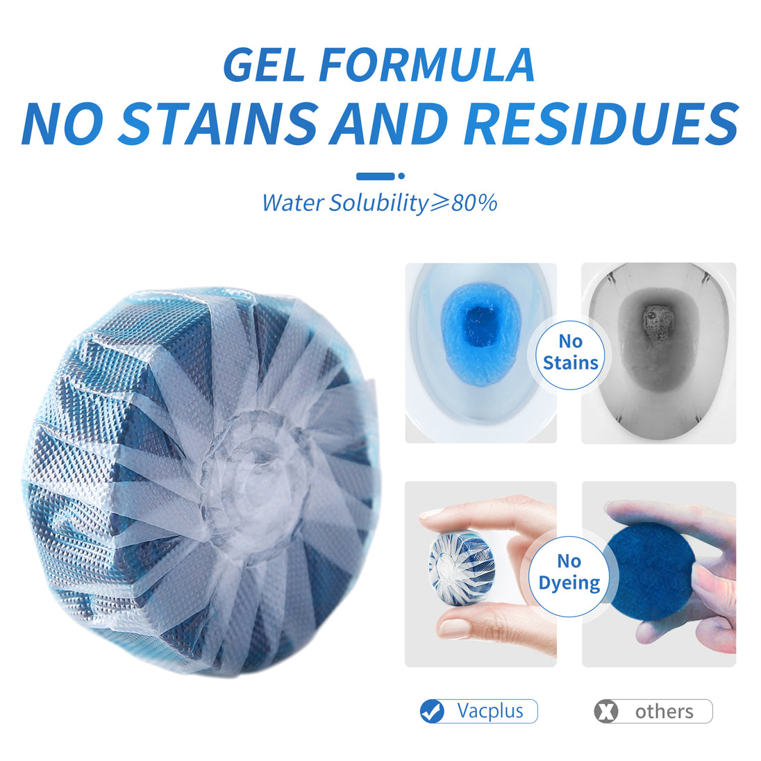 - EASY TO USE: The Vacplus toilet tank cleaner tablet is incredibly easy to use. Simply drop a tablet into the toilet tank, and then wait 30 minutes as it dissolves and turns the water blue before flushing. Each tablet is individually wrapped in a water-soluble film, ensuring your fingers stay stain-free during handling.