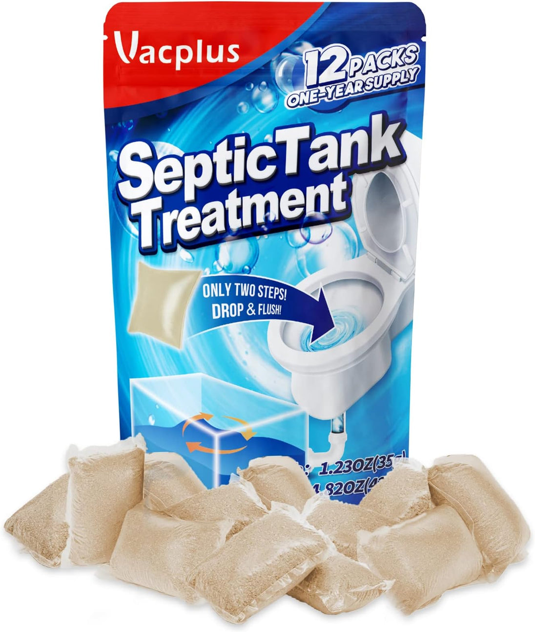 - EASY OPERATION: Vacplus septic treatment is convenient to use for maintenance. You only need to monthly drop a pack into the downstairs toilet and flush it away. Each pack of Vacplus septic tank cleaner lasts for 1 month, and the 12 packs in total can continuously clean septic tanks for a whole year!